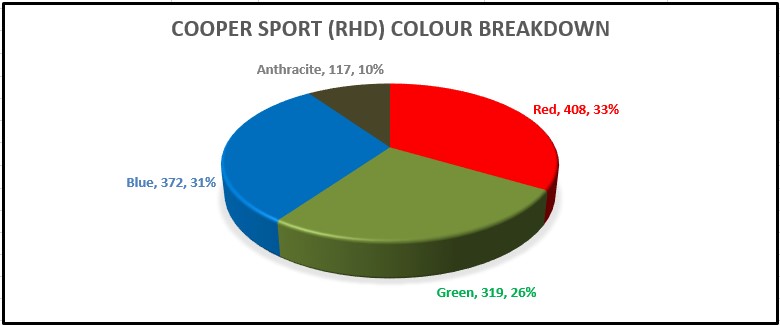 Mini Classic Cooper Sport Page The classic range launched in 2000 for the UK consisted of 3493 cars. Data from MG Rover confirms 2091 of them were the popular Cooper Sport variant. A further 704 cars were made in left hand drive format for outside of the UK, this from a total of 1707 left hand drive 'classic range' cars for the European market. This model is the final evolution of the mini, which had been seen before with the odd special edition with the sports pack flared wheel arches and 13" sports alloys. Unlike earlier cars which were Coopers with an 'optional extra' sports pack upgrade, these Cooper Sports all came as standard with the sports pack (wide arches and 13" alloys) and had a updated interior, which consisted of a stylish nickel-silver and black leather trim, polished alloy door furniture and turned-alloy fascia. The Classic Cooper Sport was available in Solar Red, Anthracite, British Racing Green and Tahiti Blue colours, all with the same black & nickel-silver leather trim. Colour breakdown from data gathered to date is as follows (this is just over half of all made, so gives a likely realistic overall percentage) :- If you own one of these special cars, please get in contact with us (see the register page) to register the car - our goal is to track down all the Classic range cars to conclude how many still survive today, and to unite owners of these cars together at displays and mini shows around the country. |
