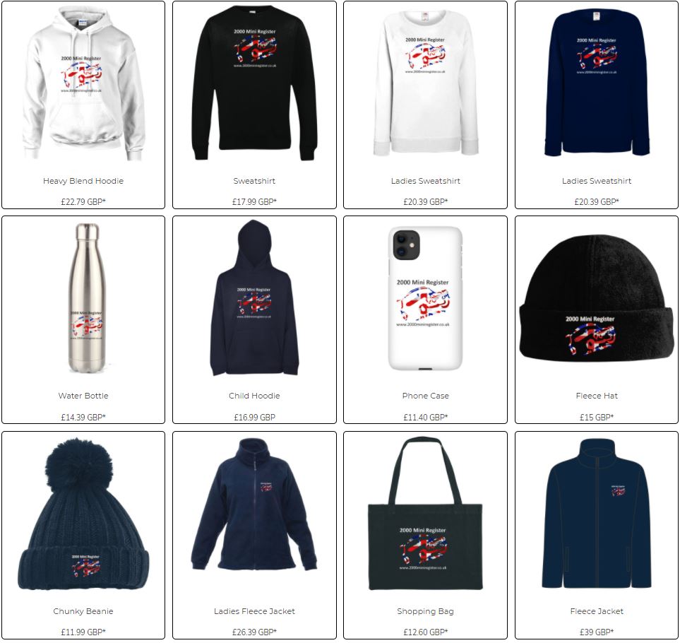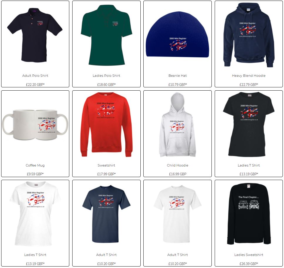 2000 Mini Register & Cooper Sport 500 Register Merchandise We have a range of great merchandise available to order for both the 2000 Mini Register and the Cooper Sport 500 Register. We have just launched our new online store for clothing and some accesories. Please order 2-3 weeks before you want the items in hand to avoid missing important deadlines if you want items for a certain event or date such as a birthday! Please follow click on the address link to visit our online shop at https://coopersport500register.theshopstore.co.uk/ which will open a new page in your browser. Some examples of the items available through the shop can be seen below - both Mini 2000 Register & Cooper Sport 500 Register branded items are available from the shop which caters for both. Select the item, size, colour and quantity of your choice, add to your shopping cart and checkout when ready. You will be sent an email to setup an account which allows you to keep track of your orders. .